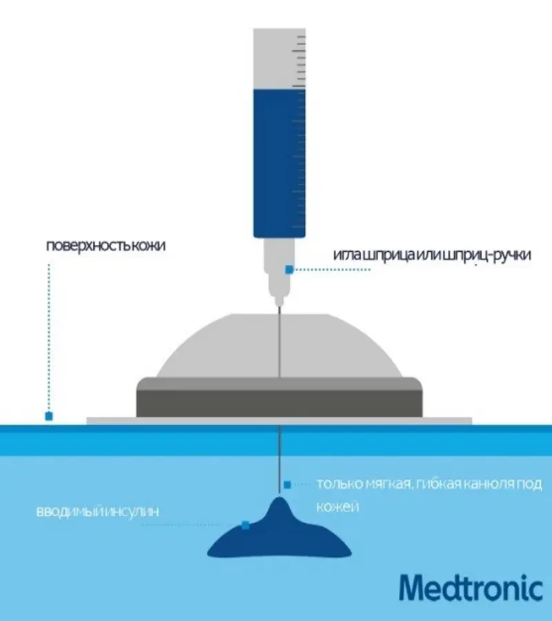 • Нижняя, подкожная часть - мягкая тефлоновая канюля, по которой инсулин попадает из мембраны сразу в подкожно-жировую клетчатку.