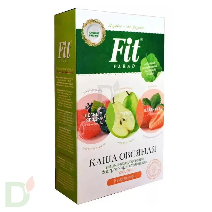 <h3>Овсяная каша на стевии ФитПарад - идеально на завтрак и перекус!</h3> <p>   </p> <p> Попробуйте ассорти из овсяных каш ФитПарад. В 1 коробке - 6 пакетиков, по 2 каждого вкуса. Каша обогащена порошком топинамбура для правильной работы ЖКТ и комплексом витаминов. </p> <p> Для вкуса добавлены натуральные порошки из сушёных ягод и фруктов и ароматизаторы. </p> <p> <strong>В 1 порции каши всего 1,6ХЕ</strong> (16,5г углеводов)! </p> <p> Еще одна отличительная особенность продукта - отсутствие глютена, который часто присутствует в обычных кашах. Поэтому овсяная каша без глютена абсолютно безопасна даже для людей с таким редким, но опасным заболеванием как целиакия. </p> <p>   </p> <div> <strong>Пищевая ценность</strong> в 100 г продукта: белки - 10,5 г; углеводы - 47,0 г (моно- и дисахариды - 1 г, крахмал - 40,0 г); пищевые волокна - 10,0 г (в т.ч. полифруктозаны (инулин и олигофруктоза) - 4,5 г); жиры - 6 г </div> <div> <strong><strong>Энергетическая ценность</strong> кКал/100 г продукта: 280 кКал / 1170 кДж</strong> </div> <div> <strong>Масса нетто</strong>: 210 г (6 пакетиков по 35г) </div> <div>   </div> <div> <strong> Состав:</strong> </div> <div>  <img width="651" src="images/com_merchant/category/sostav_grusha.jpg" height="462" border="0" alt="" style="display: block; margin-left: auto; margin-right: auto;"> </div> <br>