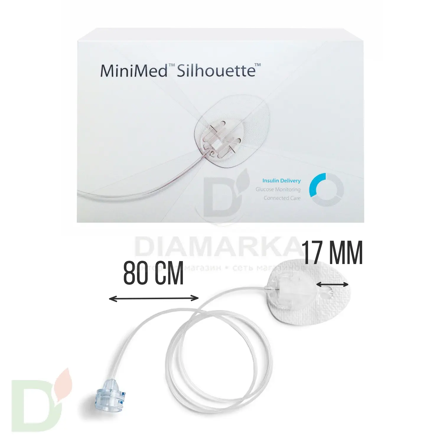 Длина канюли составляет 17 мм, а катетера 80 см. Набор рекомендуется для использования взрослыми людьми. Инфузионный набор имеет низкий профиль, закругленное основание и не выделяется под одеждой.